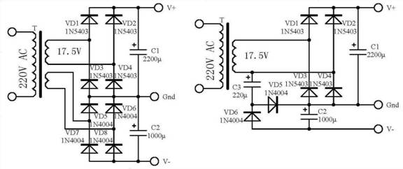 W1应采用指数式电位器,以保证在小电流时有比较好的控制特性。 如果你没有中心抽头的变压器,可以采用右图的两种输入电压电路: 当采用左边的电路时,如果负电压相差较大,整机原理图下部的元件应作相应调整。 其他元器件无特殊要求。 三、调整 安装无误后,仅有以下几处需要调整: 1、 将W1旋至最上方,调整R3使输出电流为最大值;将W1旋至最下方,调整R7使输出电流为最小值。 2、 将W2旋至最上方,调整R12使输出电压刚不为负值;将W2旋至最下方,调整R7使输出电压为最大值。R12、R20互有影响,需反复调整几次,使电位器旋至一端时电压为0,旋至另一端时为最大值 。 3、 调整R19使VT9漏极电流为4mA. 4、 R22、R23、R24可联立以下三式解出:I3×(R22+R23+R24)=I0×R0 I2×(R23+R24)=I0×(R0+R22) I1×R24=I0×(R0+R22+R23) 式中I0是你的电流表的灵敏度,R0是你的电流表的内阻,I1=1A、I2=0.1A、I3=10mA是分流后的电表量程,以上五个量都是已知数。只有R22、R23、R24是未知量,有初中文化的即可极易解出。 四、使用
