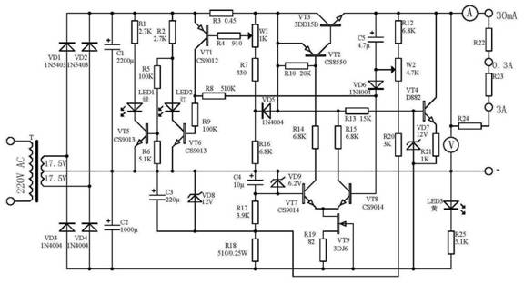稳压稳流性能良好,在输出电压很低的情况下,仍有很好的恒流特性。 5、 除作电源用外,可以很方便的用来精确的测试某些非线性电子器件的参数和绘制伏安特性曲线,以及用来为蓄电池充电,或激活蓄电池等。 6、 采用半导体分立器件,有利于制作者对电子知识的理解,制作也很方便。 右图是原理图: 整个电源由主控电路、电压检测电路、电流检测电路、状态指示电路几部分组成。 主控电路的调整三极管采用集电极输出方式,放大能力高,电压损失小。为了从0伏起调,增加了一组负电源,并且采用了恒流泄放方式。这样电压很低时输出端也有一定的泄放电流,既保证了作电压源时调整电路始终处在放大状态,也保证了作电流源时输出电流恒定不变。 控制电流由VT8的基极输入,当输入电流增加时,VT8发射极电压增加,即VT9发射极电压增加,进而使VT9发射结电压降低,VT9集电极电流降低,VT2、VT3导通降低,输出电压或电流将下来。 反之,则VT2、VT3导通加剧,分析同。 电压检测接在输出端与-12V之间。因为R8、R9阻值很大,所以对这电压检测电路影响不大。 电流检测由R8接入。VD5两端-0.7V的电压经W1分压后加至VT1的基极,当这个电压U1加上通过R3的电流所产生的电压 降 U1+ I×R3=0.6V 时,VT1导通进入恒流状态,由上式可得 I=0.6V/R3-U1/R3 因为R3是一个常数,由上式可以看出I的大小取决于U1的大小,并且U1=0时I最大,为0.6V/R3,U1=0.6V时I=0。这样就可以通过调整U1的大小来调整输出电流的大小。 VT5和VT6用来指示电源的工作状态。工作在稳压状态时VT5通过R2、R5得到基极电流而导通,LED1亮,说明工作在稳压状态;当电流增加VT1导通时,通过R9使VT6导通LED2亮,说明工作在稳流状态。同时使VT5的基极电压降至它的导通电压以下,LED1灭。LED3为电源指示灯。 二、元件选择
